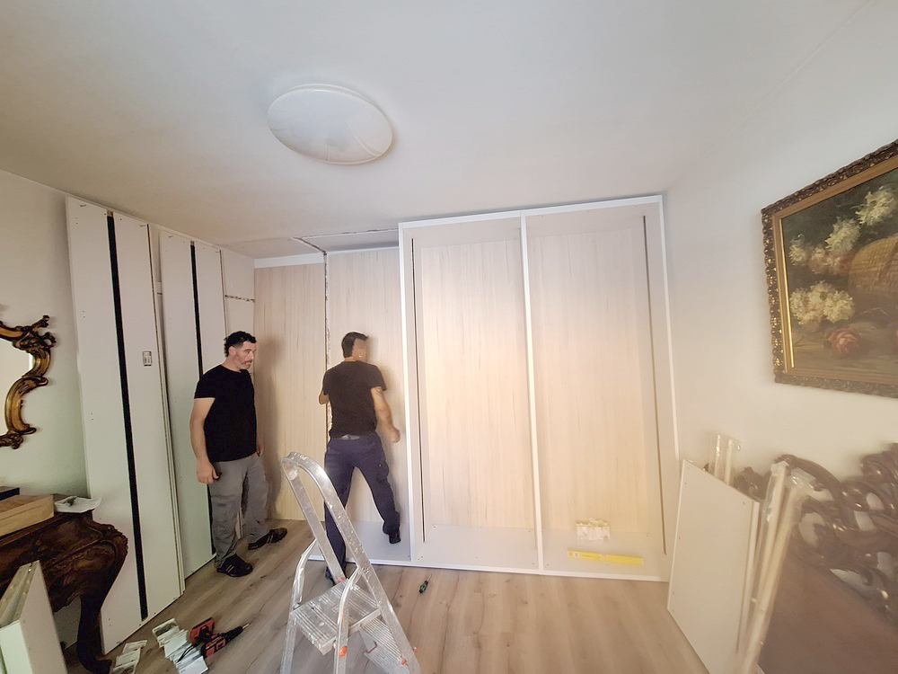 La habitación tenía una limitación importante: si se colocaba un armario estándar, la puerta no podía abrirse por completo, lo que dificultaba la entrada y salida. Nuestro reto fue diseñar un armario que se adaptara a esta condición, sin renunciar a la capacidad de almacenaje y asegurando un aspecto elegante que se integrara con la decoración existente.