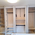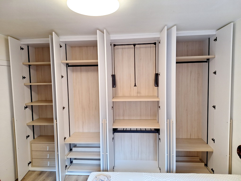 Diseñamos un armario con dos profundidades distintas: más reducido en la zona próxima a la puerta para permitir su apertura completa, y más profundo en el resto de módulos para optimizar la capacidad interior. El exterior se acabó en color blanco mate, aportando luminosidad y sensación de amplitud, mientras que el interior se fabricó en acabado haya, creando un contraste cálido y elegante. Los estantes se montaron con un sistema de riel central, lo que permite moverlos hacia arriba o abajo con facilidad según las necesidades de uso.