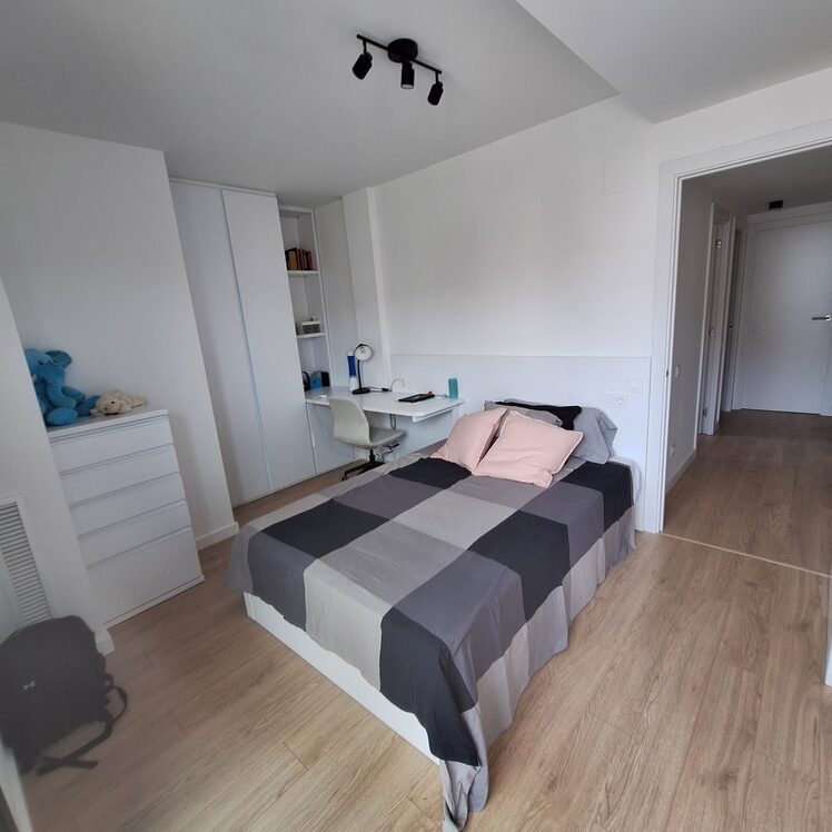 Optamos por una cama de matrimonio con arcón abatible, que ofrece un gran espacio de almacenaje oculto. El cabecero con iluminación LED aporta un ambiente cálido y moderno, ideal tanto para estudiar como para relajarse. Diseñamos además una zona de estudio con librería y armario a medida, todo integrado en una misma composición que equilibra funcionalidad y estética.
