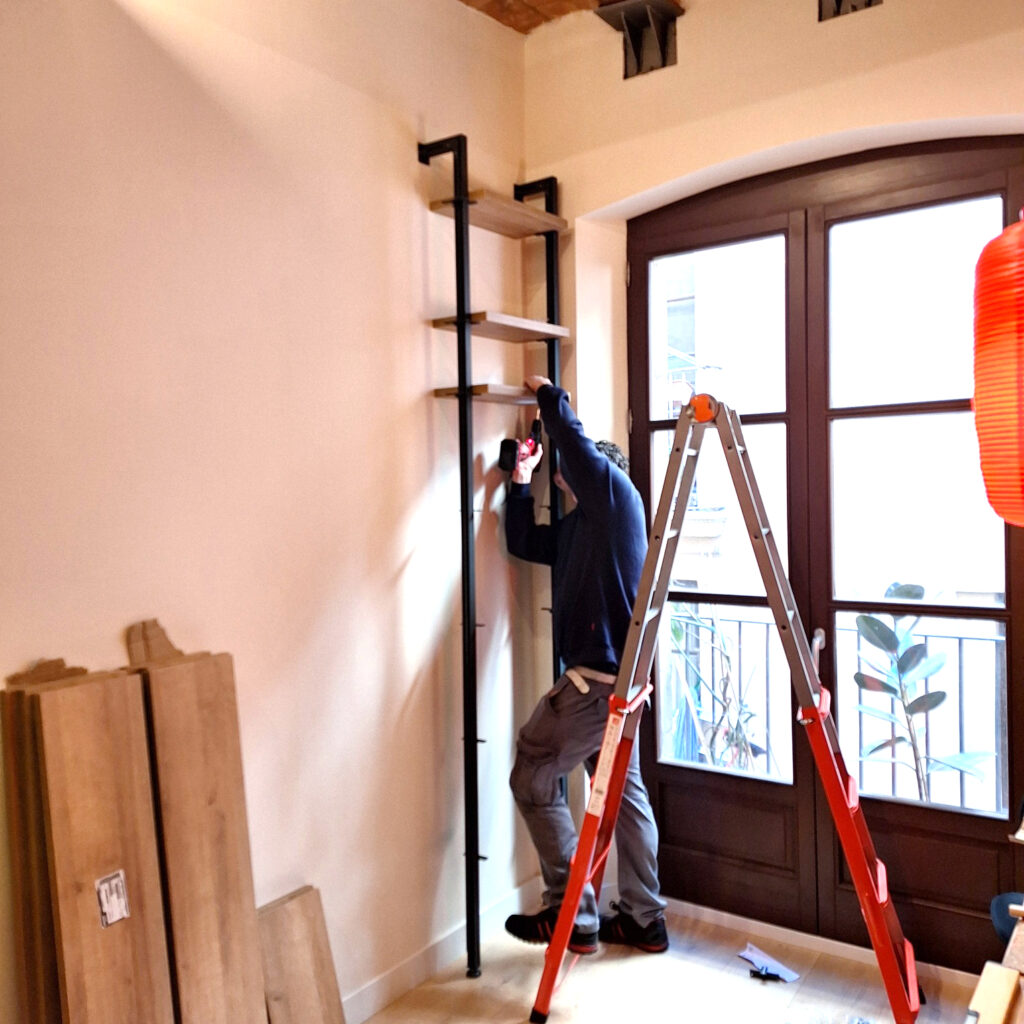 - Máxima Flexibilidad: La clave del diseño. Gracias a las guías perforadas de los soportes metálicos, los estantes se pueden modificar en altura fácilmente. Esto permite al cliente adaptar la librería a sus necesidades, ya sea para libros de arte, objetos decorativos o futuros cambios.